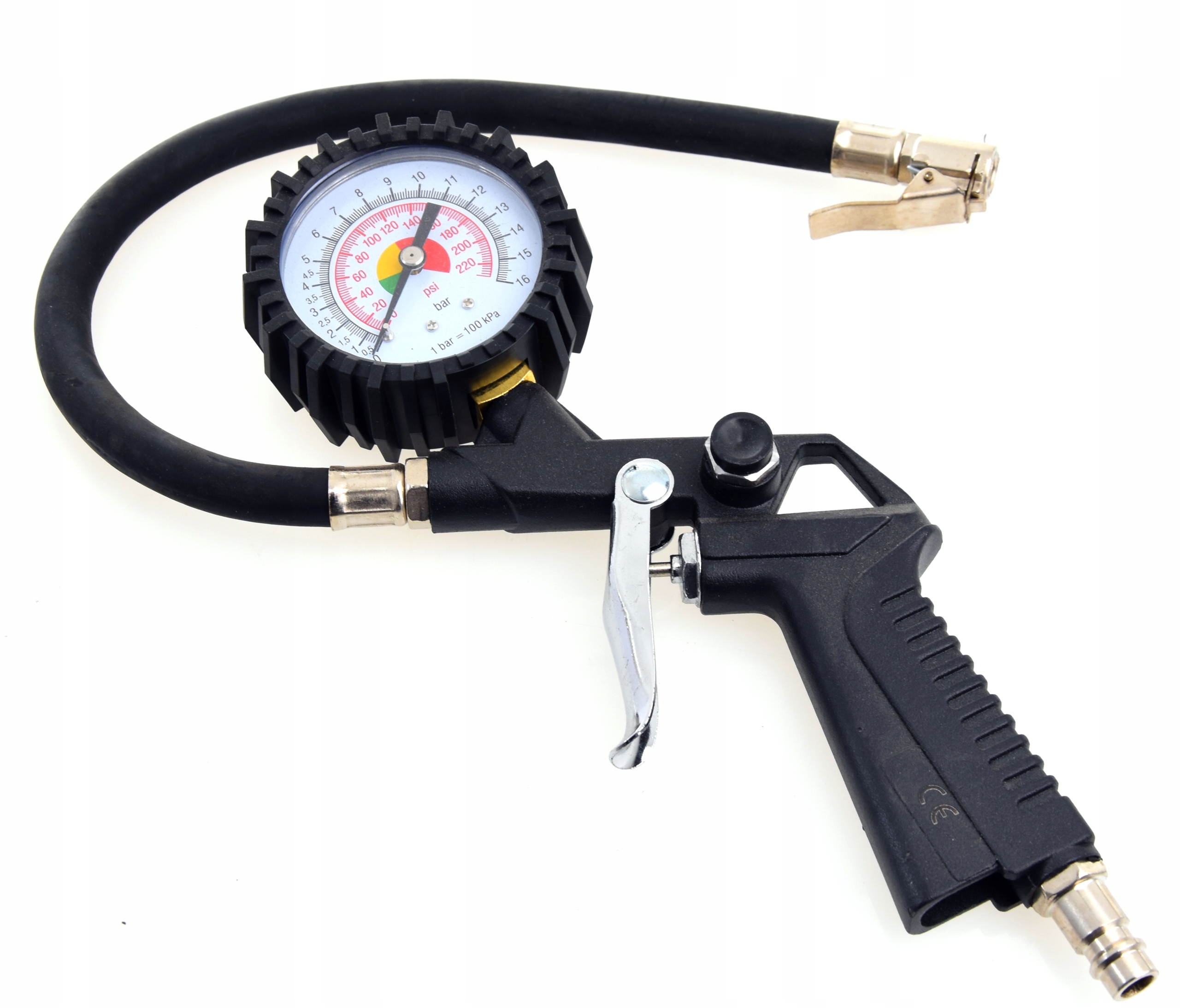 Используется для контроля давления в шинах автомобилей. Кнопка спуска обеспечивает плавный сброс излишнего воздуха в шинах. Корпус пистолета выполнен из металла.